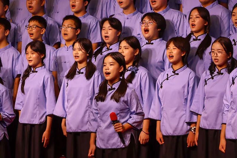 舞台上,同学们风采卓然。指挥昂首立于台前,双手不断划出有力的弧线,引领着声浪的洪流。