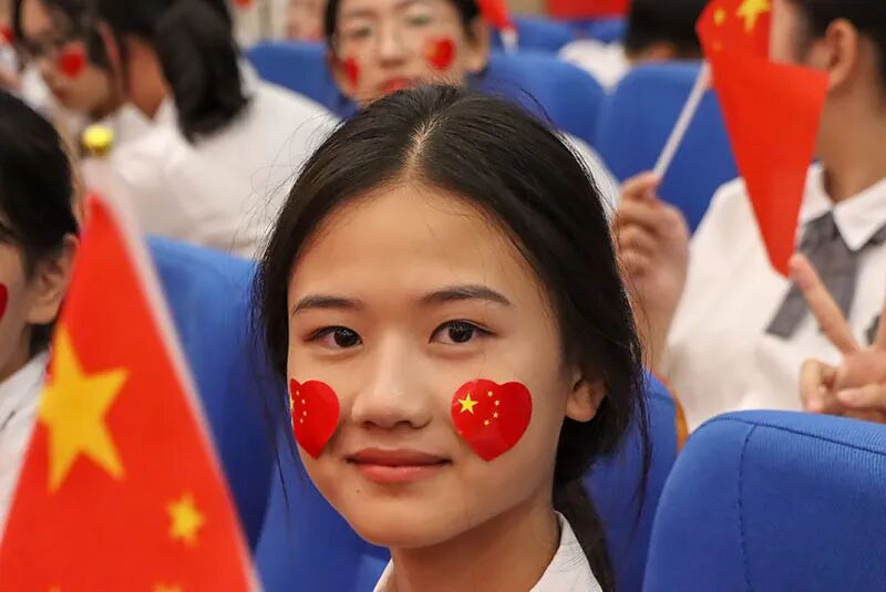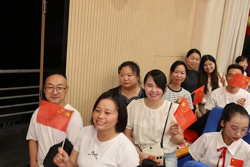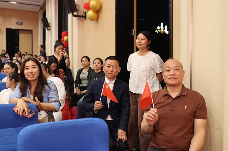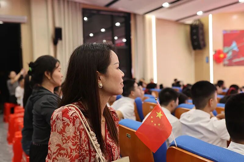 观众席上,早已是红旗的海洋。师生们用力挥舞着手中的国旗,那片炽热的红色随之汇成一片跃动的海洋。他们的每一次喝彩、每一道目光,都化为无形的力量,将全场的气氛推向高潮,共同点燃了这份深沉而炽热的红色情怀。