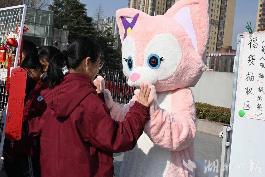 活动现场,红纸金墨的“福”字展区传递真挚祝福,同学们将亲手书写的“福”字悬挂成展,字句间藏着对自己的期许、对亲友的感恩。《我的2025年度小书》陈列区,“勇敢”“蜕变”等关键词成为青春注脚,见证同学们与过去温柔道别。红包墙前,抽取《答案之书》启示卡的同时,石膏娃娃兑奖券为冬日添了一份雀跃的欢喜;情绪急救专区,玲娜贝儿人偶带领体验“478呼吸法”“蝴蝶拍”,用简单动作化解压力。福袋抽取区的彩色纸签化作“心灵小锦囊”,拥抱互动区的温暖触碰则打破陌生距离,让“我在这里”的安心感流动全场。
