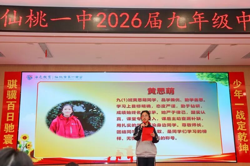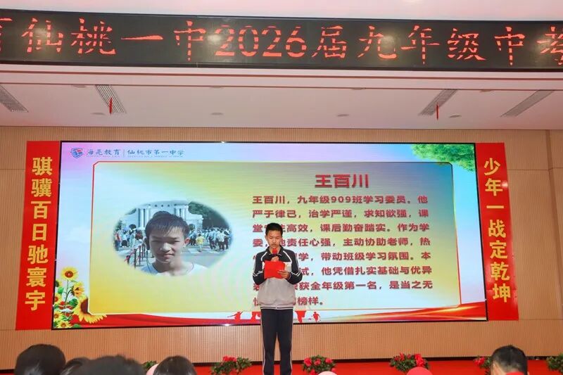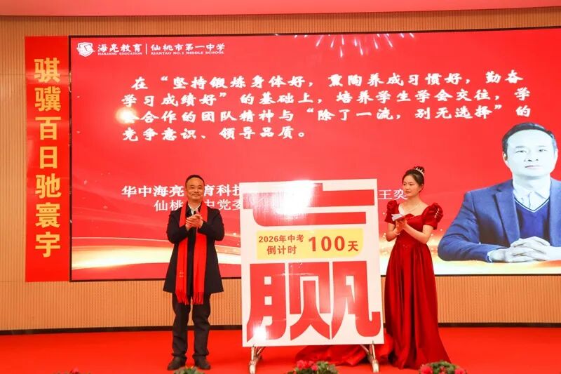 仙桃一中党委书记、校长王奕揭开“距中考100天”的倒计时牌,台下,学子们屏息凝神,眼中跃动着渴望与决心的火焰——那是青春的锋芒,是三年寒窗淬炼出的斗志。