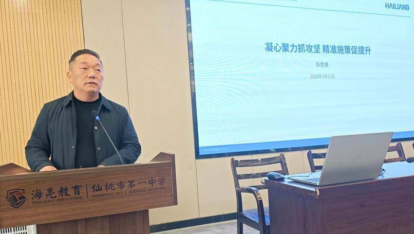 3月12日,仙桃一中2026届高三全体教师汇聚于高中部多媒体教室,召开二轮复习启动部署会议。高三年级副主任杜庆主持会议,海亮教育文昌中学集团校总校长周静忠、海亮教育江陵一中校长刘德敬等一行受邀到场,参与交流研讨。