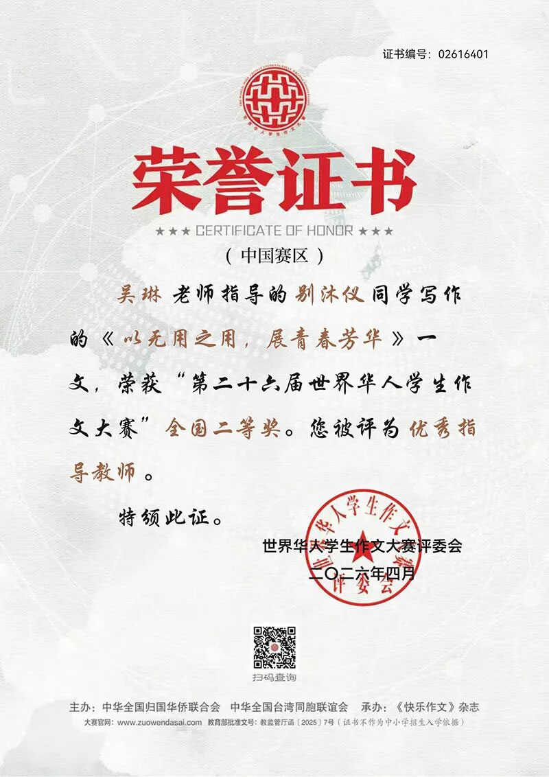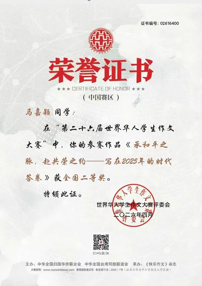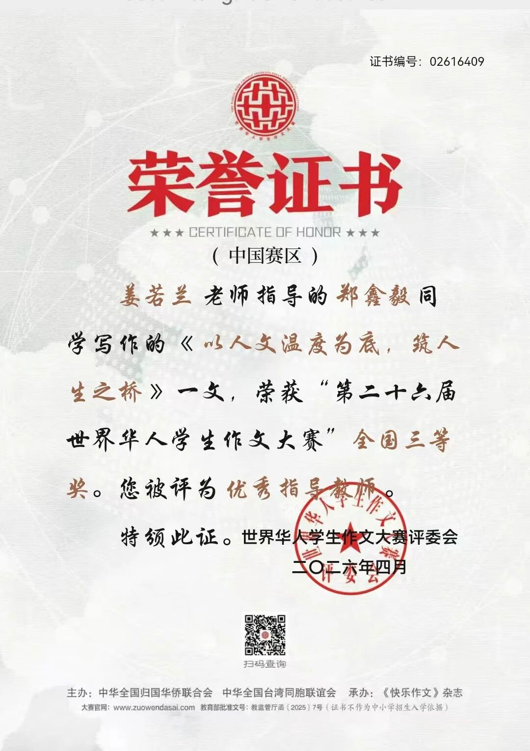 这份荣耀,是学子们笔耕不辍的硕果,是老师们诲人不倦的见证,更是学校“以文育人、以文化人”教育理念的生动实践,未来,我校将继续搭建多元成长平台,秉持“因材施教”的原则,鼓励学生以笔为翼、以文传情,在更广阔的舞台上展现青春风采,书写属于新时代的少年华章!