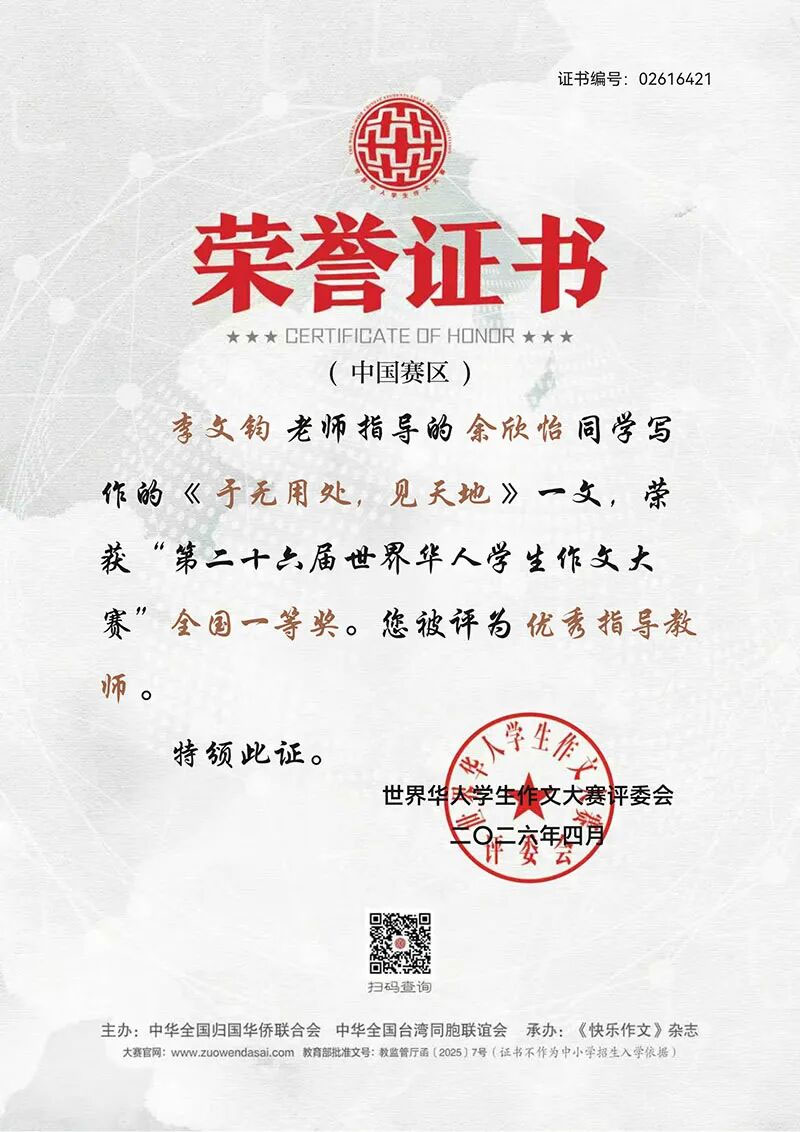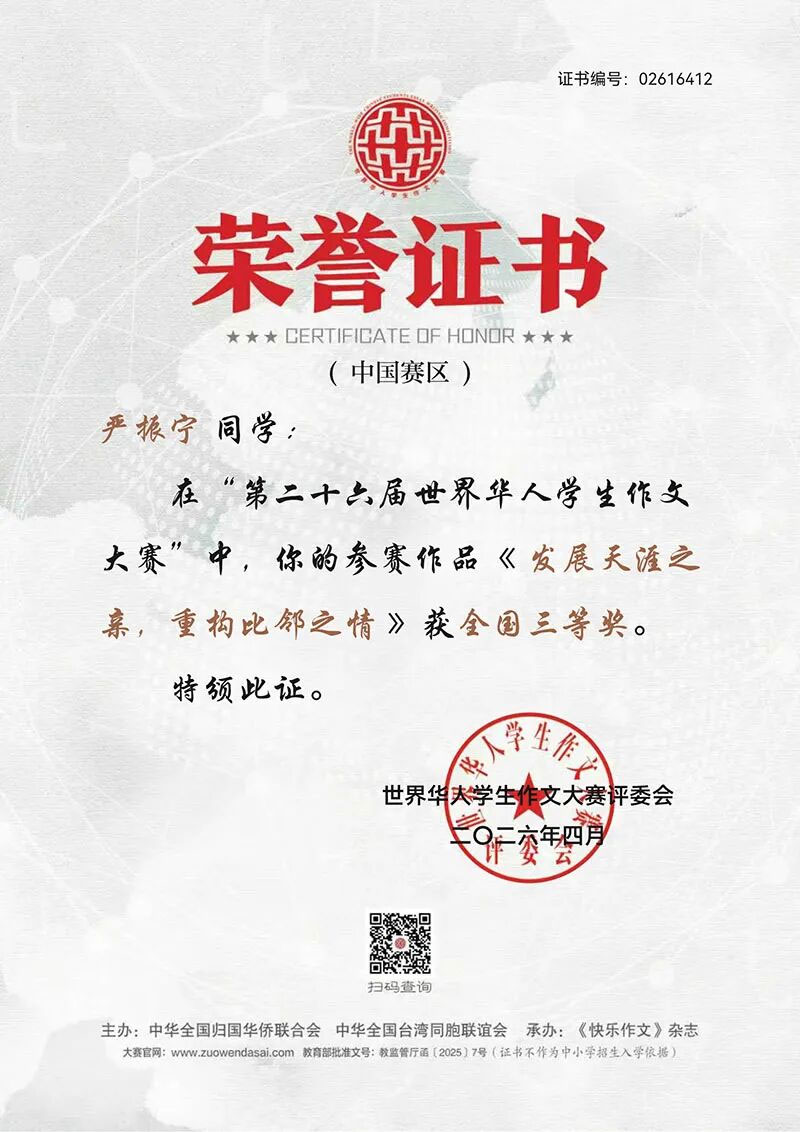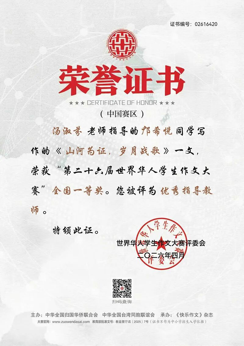 “世界华人学生作文大赛”属于教育部发布的“白名单赛事”。本届大赛共吸引了来自73个国家和地区的3880所学校、570多万名学生参加,评委会共收到复审稿件55万多份,堪称华语写作界的“巅峰盛会”。
