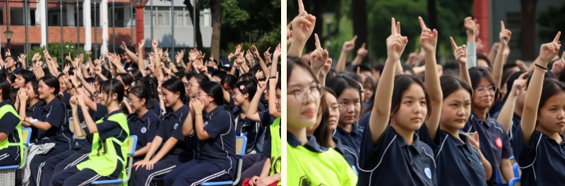 壮观场面令人动容:学子们高举右手,声音一浪高过一浪,仿佛在向世界宣告自己的决心。