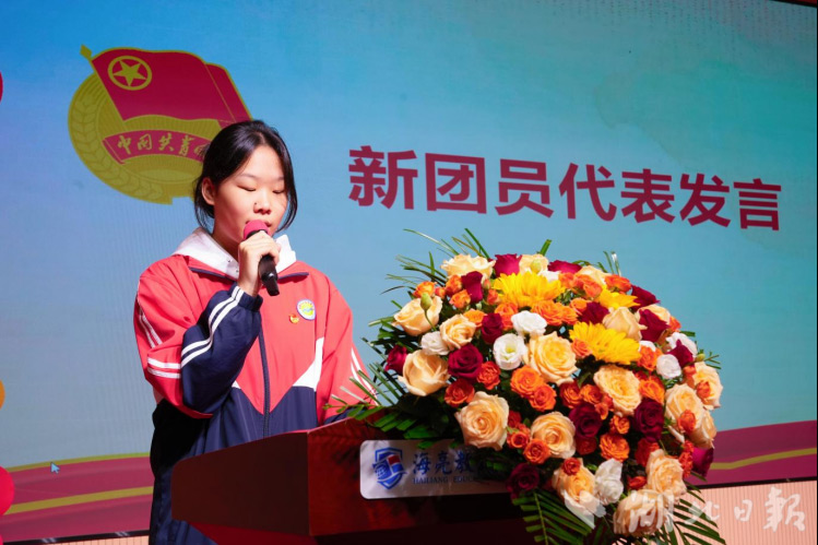优秀新团员代表、实验高中关馨宇同学发言,表示将以实际行动践行团员责任,扛起青年新担当。
