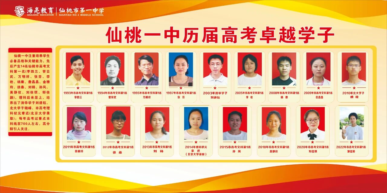 仙桃一中注重培养学生必备品格和关键能力,先后产生14名仙桃市高考文科第一名(李四兰、管云武、万明祥、张芬、李栓、杨康、詹晶晶、金雅玲、徐桑、刘铸、孙凤、吴静仪、刘佳琪、邹佳颖),理科后来居上,培养出了清华学子刘道钰、北大学子魏峰、市高考理科状元章迟(北京大学录取);每年高考过重点本科线在700人左右,高分群引人关注。