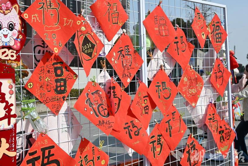 活动现场,红纸金墨的“福”字展区传递真挚祝福,同学们将亲手书写的“福”字悬挂成展,字句间藏着对自己的期许、对亲友的感恩。《我的2025年度小书》陈列区,“勇敢”“蜕变”等关键词成为青春注脚,见证同学们与过去温柔道别。红包墙前,抽取《答案之书》启示卡的同时,石膏娃娃兑奖券为冬日添了一份雀跃的欢喜;情绪急救专区,玲娜贝儿人偶带领体验“478呼吸法”“蝴蝶拍”,用简单动作化解压力。福袋抽取区的彩色纸签化作“心灵小锦囊”,拥抱互动区的温暖触碰则打破陌生距离,让“我在这里”的安心感流动全场。