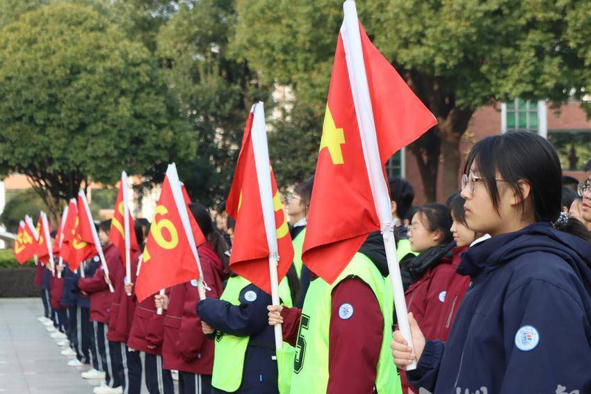 国旗仪仗队迈着整齐的步伐入场,全场瞬间肃静。伴随着雄壮的国歌声,五星红旗冉冉升起,全体师生庄严肃立,向国旗行注目礼,目光中饱含对国家的赤诚与敬意。