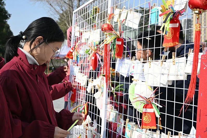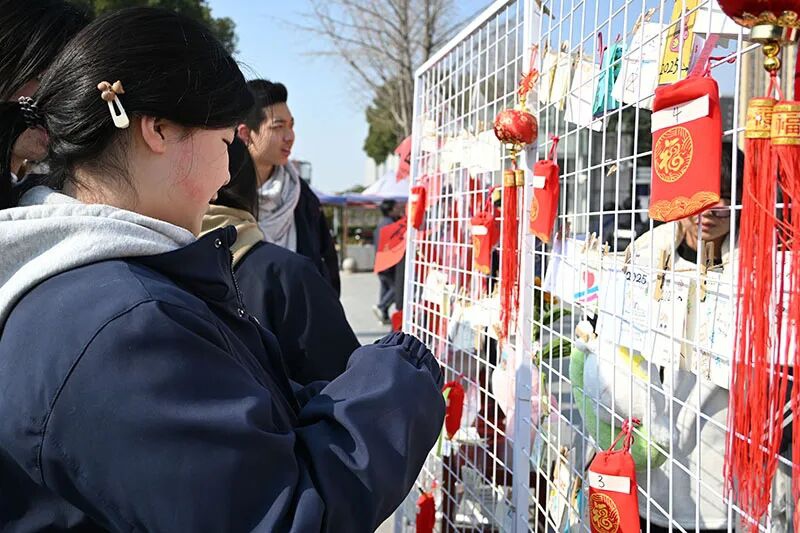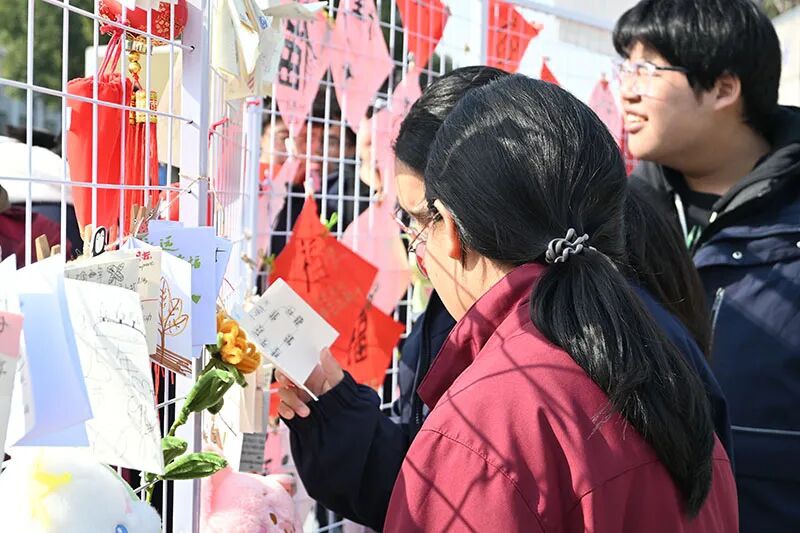 活动现场,“福”字展示区率先成为焦点。红纸铺展,金墨挥洒,同学们亲手书写的“福”字不仅是对新年的期盼,更藏着细腻的情感——有人想把福气送给自己,愿新一年“勇敢坚定”;有人写给家人,感恩“朝夕陪伴”;还有人赠予师友,铭记“同行时光”。当一幅幅福字悬挂成展,红色的暖意便在广场上流动,为冬日校园添了一份“双向奔赴”的温情。