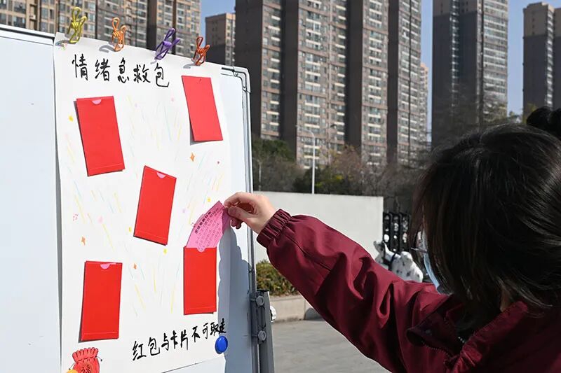 福袋抽取区前,同学们凭直觉选号抽签。“你值得被爱”“今天的你也很努力”……彩色纸签上的文字像一颗颗小太阳,被小心折好放进书包。这枚“心灵小锦囊”,成了他们随身携带的勇气来源。