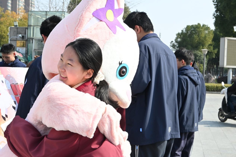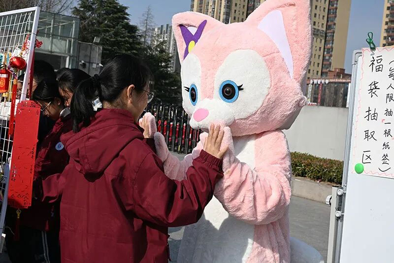 红包墙前的队伍排起了长龙。同学们闭眼默念心中困惑,随机抽取《答案之书》的启示卡——“值得去做的事”“学会自我欣赏,你很棒”。更有趣的是,部分红包藏着“惊喜彩蛋”,抽中兑奖券的同学抱着石膏娃娃笑靥如花,让冬日的校园多了份孩子气的雀跃。