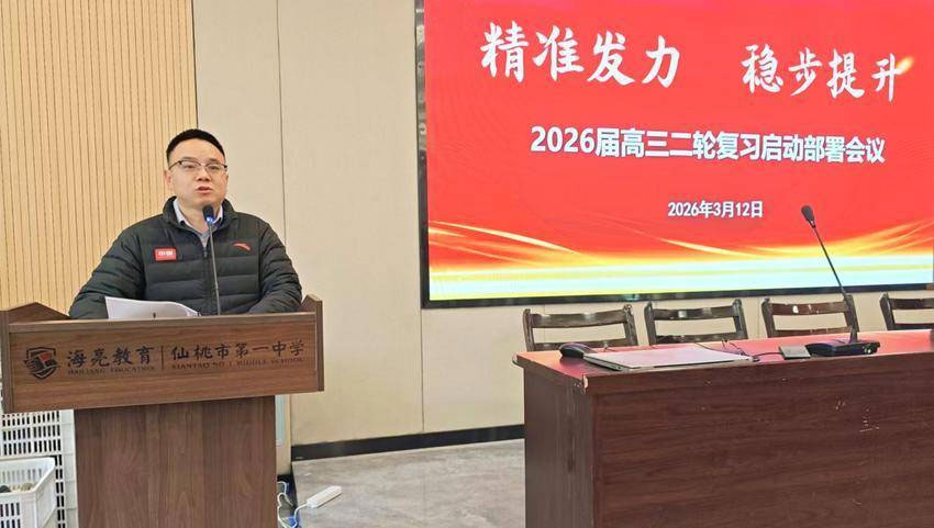 3月12日,仙桃一中2026届高三全体教师汇聚于高中部多媒体教室,召开二轮复习启动部署会议。高三年级副主任杜庆主持会议,海亮教育文昌中学集团校总校长周静忠、海亮教育江陵一中校长刘德敬等一行受邀到场,参与交流研讨。