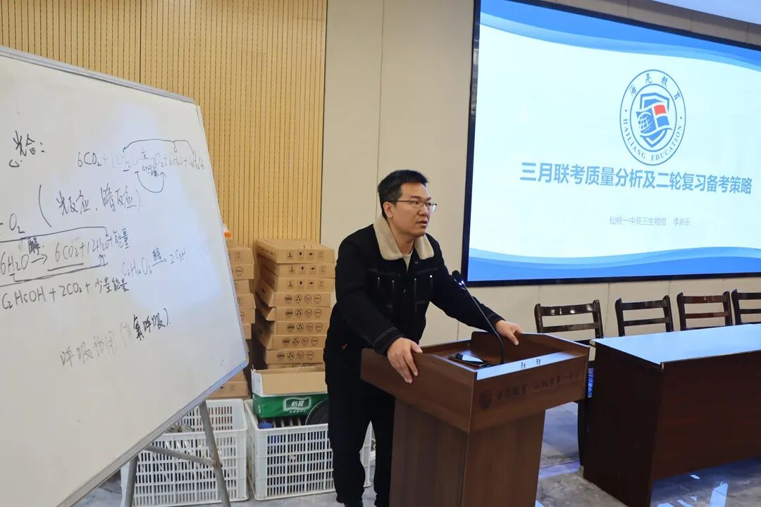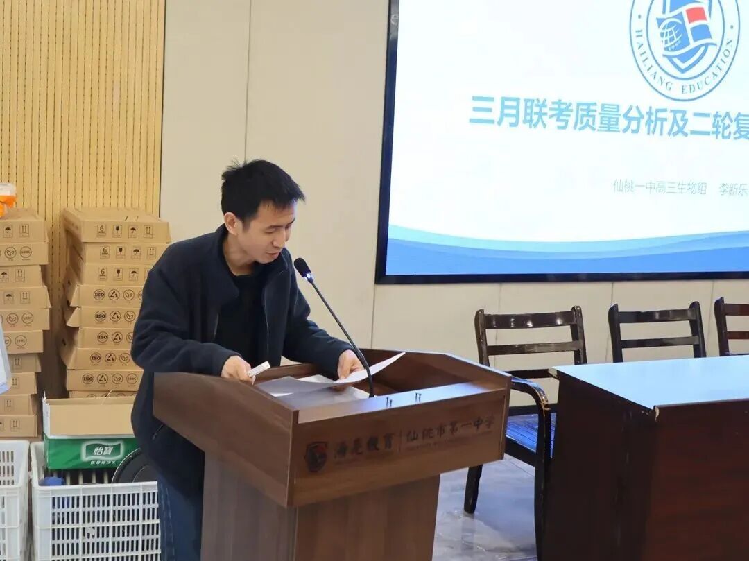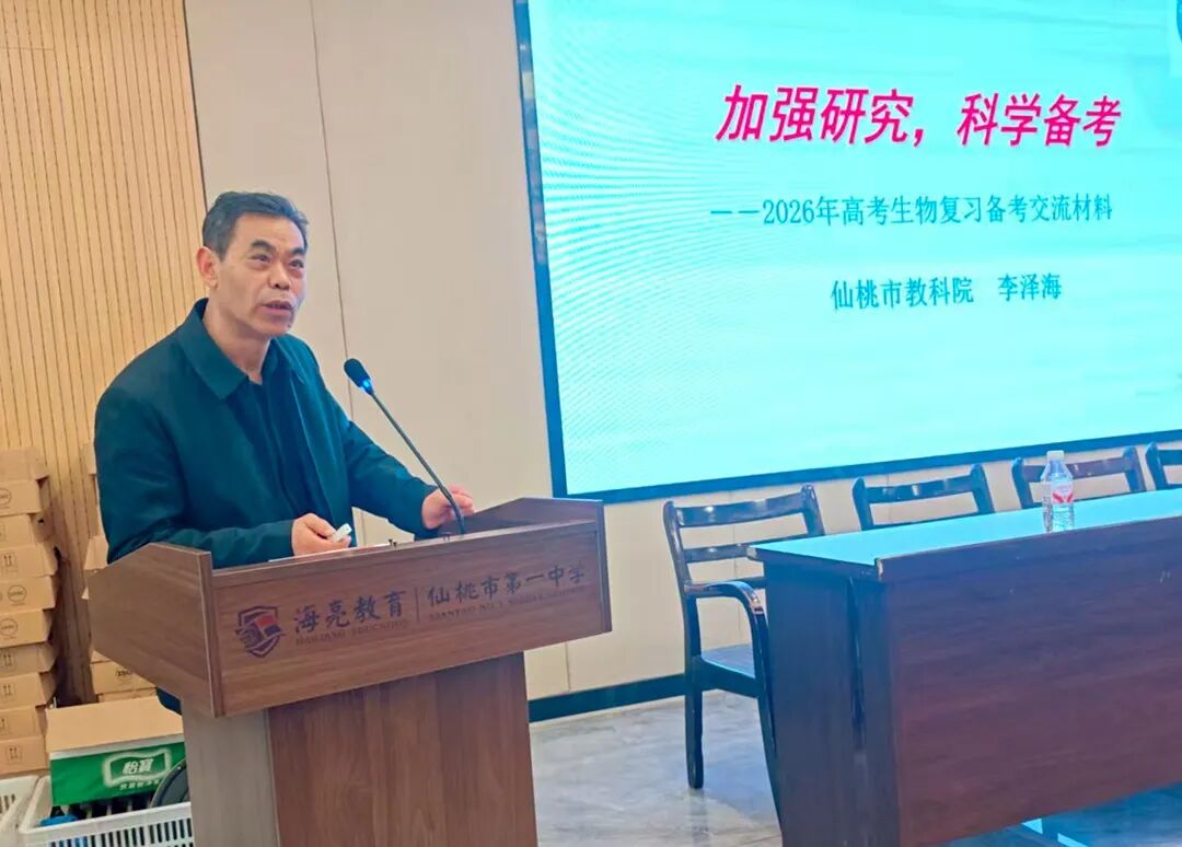 会议最后,生物教研员李泽海作了题为“加强研究,科学备考”的学科质量分析报告。他肯定了仙桃一中和仙桃中学在三月生物考试中取得的好成绩,随后深入分析了高考命题的人员构成及命题依据——“一核四层四翼”,即以立德树人为核心的考核方向,以核心价值、学科素养、关键能力、必备知识为内容的考核维度,以及以基础性、综合性、创新性、应用性为代表的考核要求。针对后段二轮复习备考,李泽海建议高三教师务必帮助学生以专题突破的方式提升关键能力,回归教材,精讲精练,并进一步规范答题要求,确保复习备考工作精准高效。