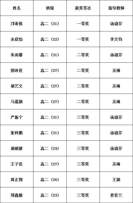 近日,由中国侨联、全国台联主办,河北阅读传媒有限责任公司《快乐作文》杂志承办的第二十六届世界华人学生作文大赛结果公布,我校高二年级二名学生获一等奖,四名学生获二等奖,六名学生获三等奖,汤淑芬、李文钧、吴琳、王颖、姜若兰五位教师获优秀指导教师奖。