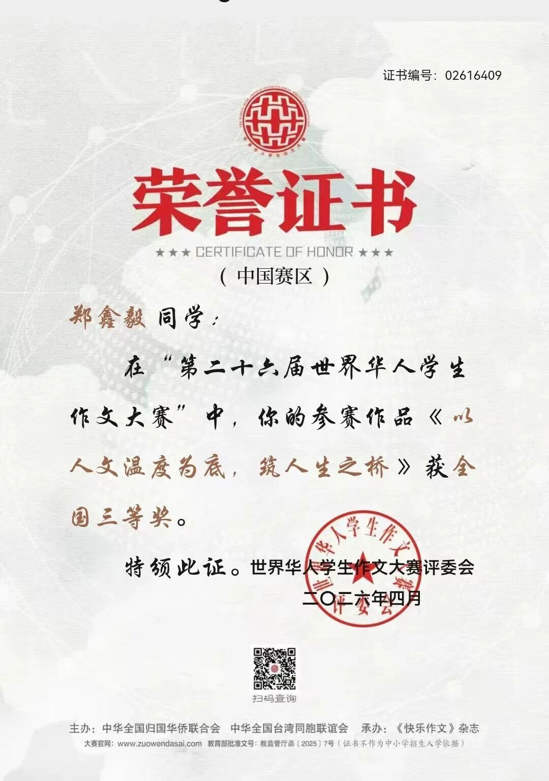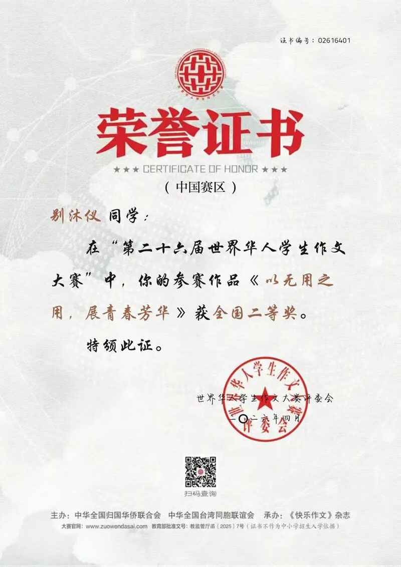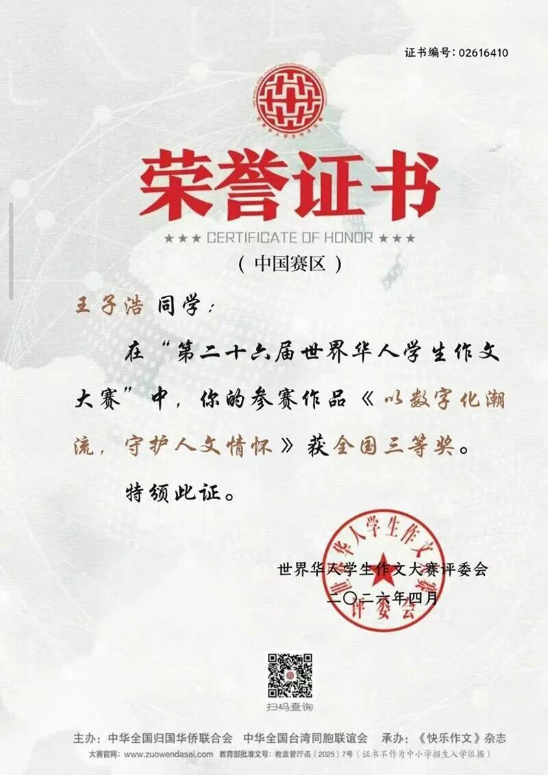 这份荣耀,是学子们笔耕不辍的硕果,是老师们诲人不倦的见证,更是学校“以文育人、以文化人”教育理念的生动实践,未来,我校将继续搭建多元成长平台,秉持“因材施教”的原则,鼓励学生以笔为翼、以文传情,在更广阔的舞台上展现青春风采,书写属于新时代的少年华章!