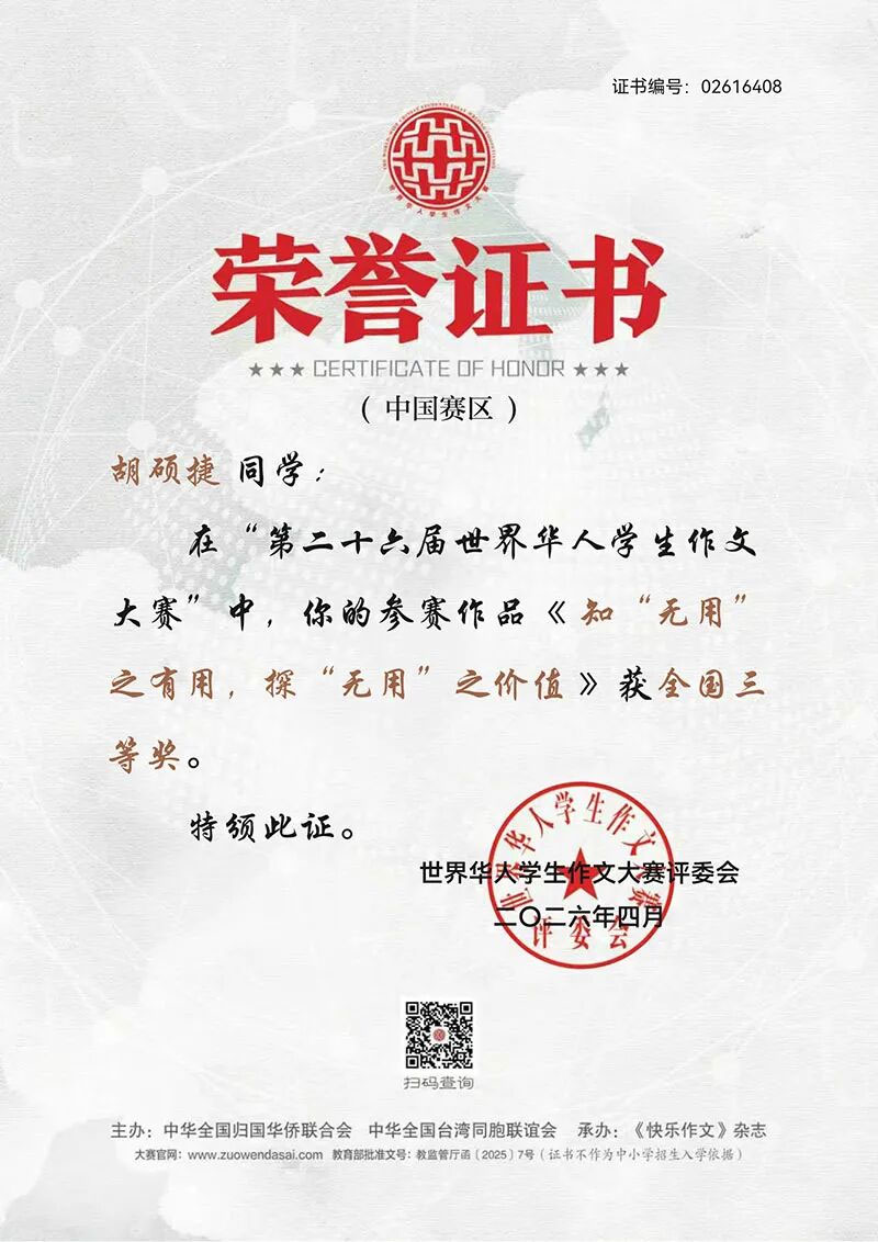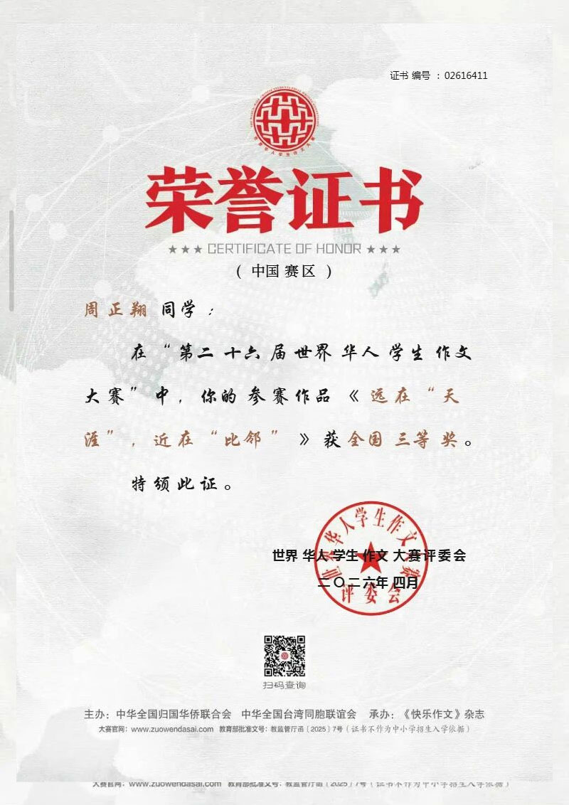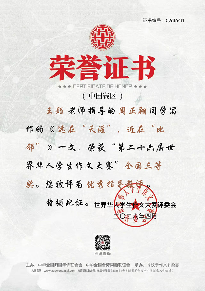 “世界华人学生作文大赛”属于教育部发布的“白名单赛事”。本届大赛共吸引了来自73个国家和地区的3880所学校、570多万名学生参加,评委会共收到复审稿件55万多份,堪称华语写作界的“巅峰盛会”。