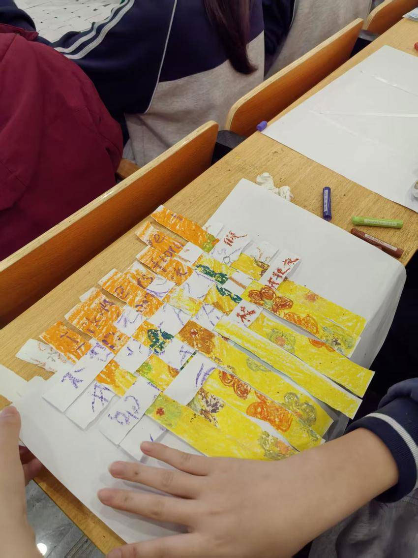 刘老师随后提出问题:“如果用两幅画记录最近的积极与消极情绪,再将其撕碎、交叉、重组,新作品会揭示什么?”