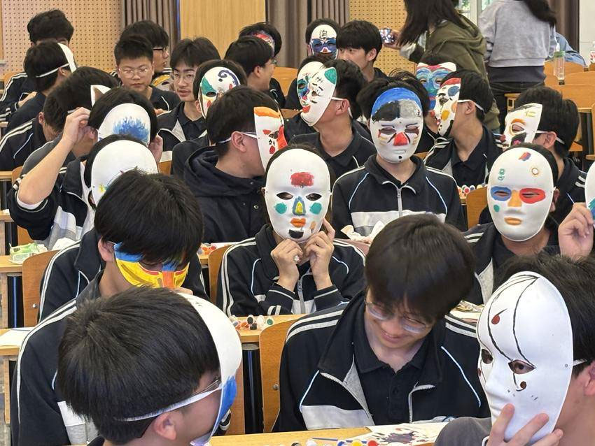 学生们在欣赏京剧之美的同时,理解了“面具”的积极意义:它非伪装,而是自我保护的智慧。随后,学生们以画笔为工具,自由创作个人面具:暖色调配星星图案的活泼开朗,冷色调加简约线条的内敛专注……作品分享环节成为高潮,学生们勇敢登台,讲述面具背后的故事与心理感悟。真挚的解读不仅深化了自我认知,更在班级中营造出相互理解、彼此欣赏的温暖氛围。